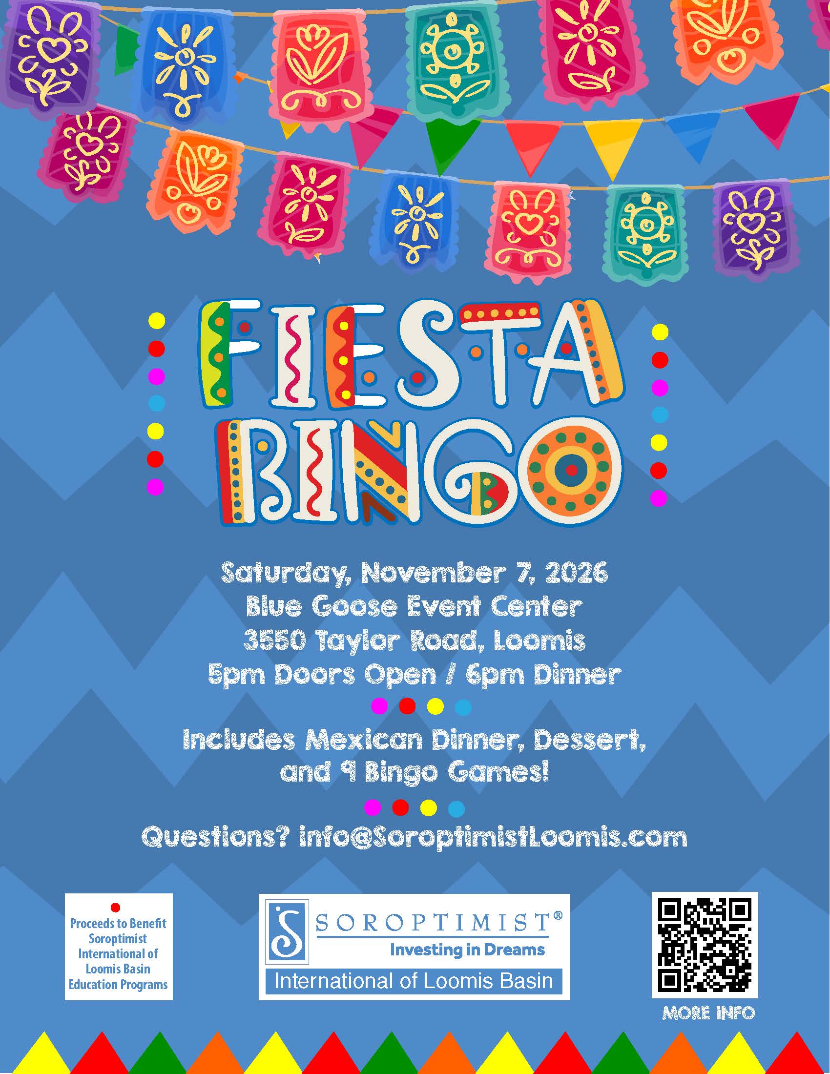 Fiesta Bingo will be held on Saturday, November 7, 2026 at the Blue Goose in Loomis.